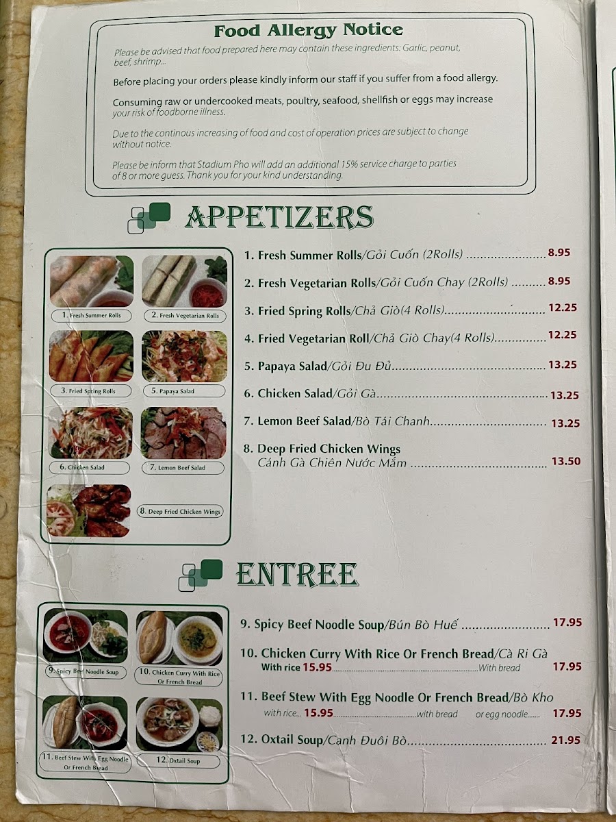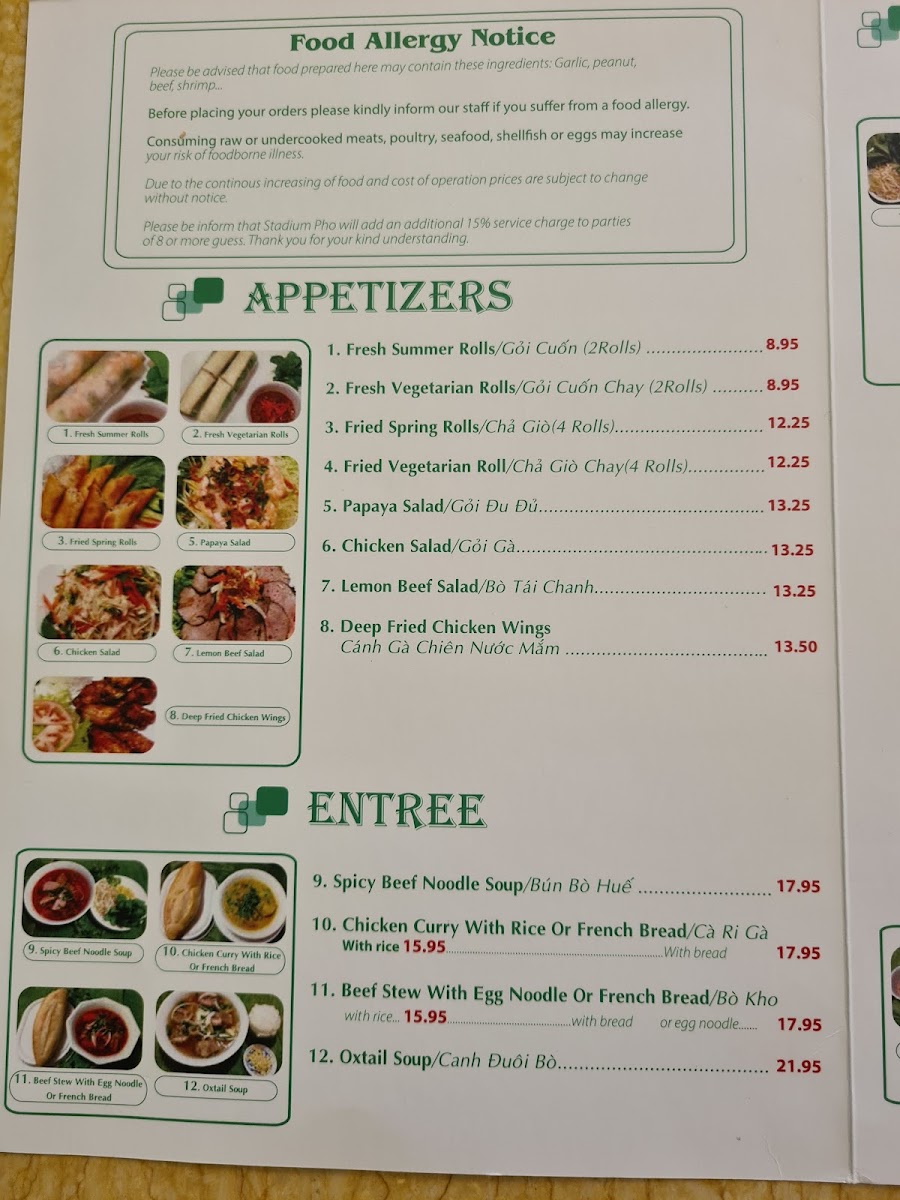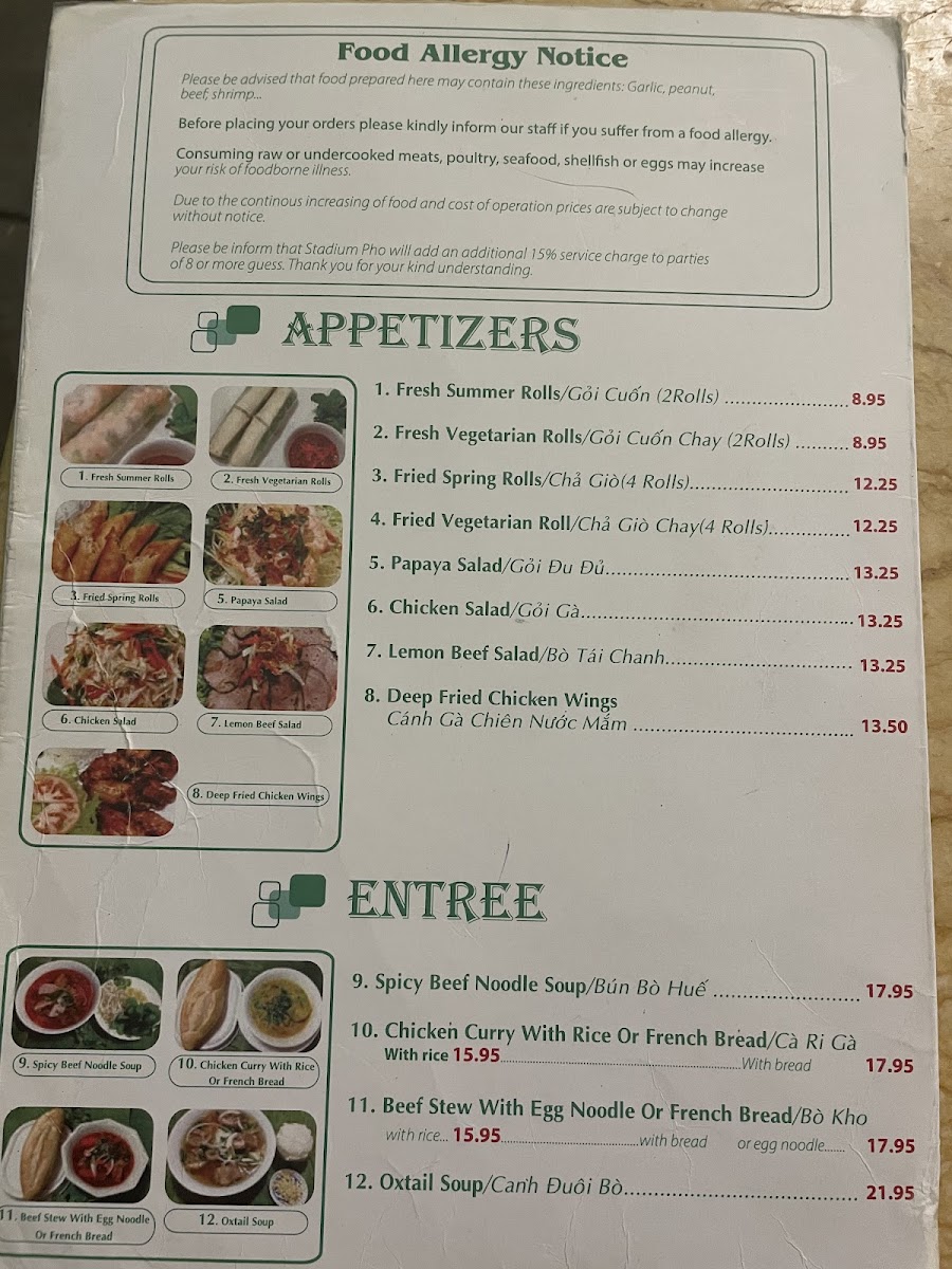 Stadium Phở offers a straightforward and comforting menu centered around traditional Vietnamese favorites. This is a place where warm bowls of pho and fresh, flavorful bites come together to create meals that feel both satisfying and familiar. Whether you're stopping by for a quick lunch, a casual dinner, or a laid-back takeout experience, the menu caters to moments when a hearty, home-style meal hits the spot.