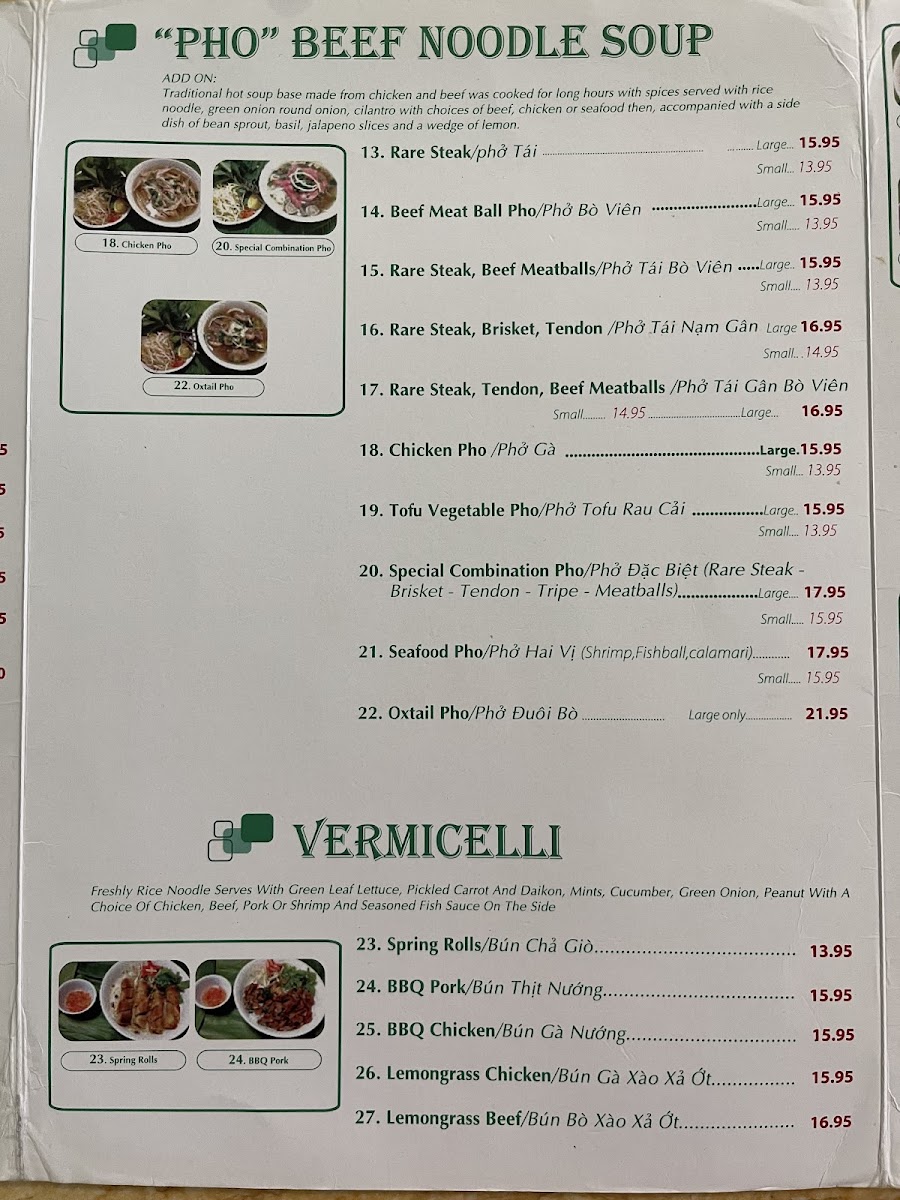 Typical highlights include their signature pho varieties such as Rare Steak Pho, Beef Meatball Pho, and Tofu Vegetable Pho, alongside lighter options like spring rolls and papaya salad. The menu also features dishes that invite sharing, like deep-fried chicken wings and BBQ short ribs with shrimp plates, perfect for enjoying with friends or family.